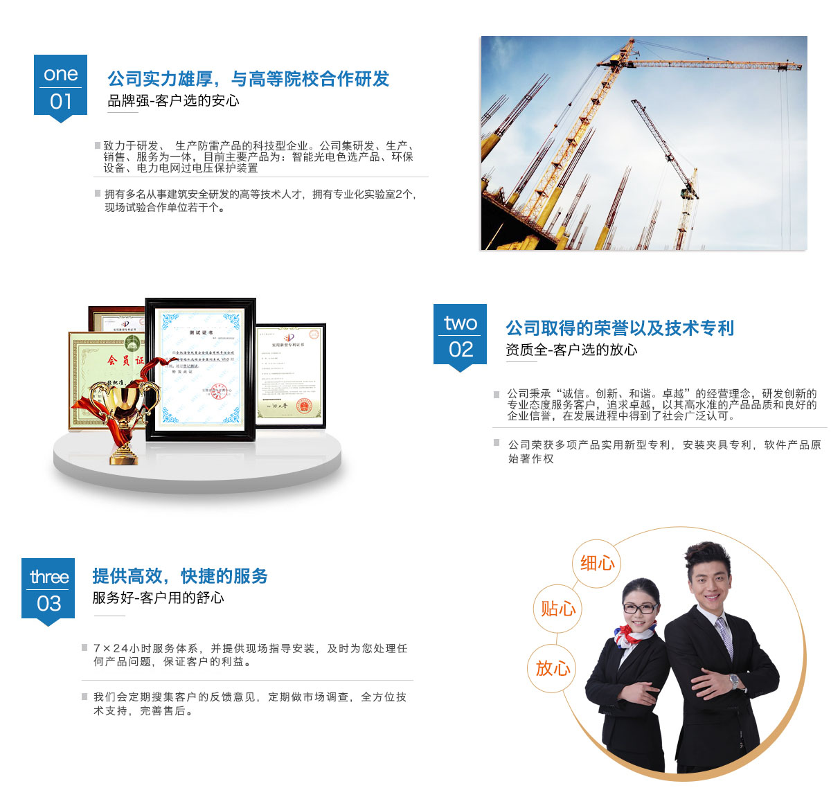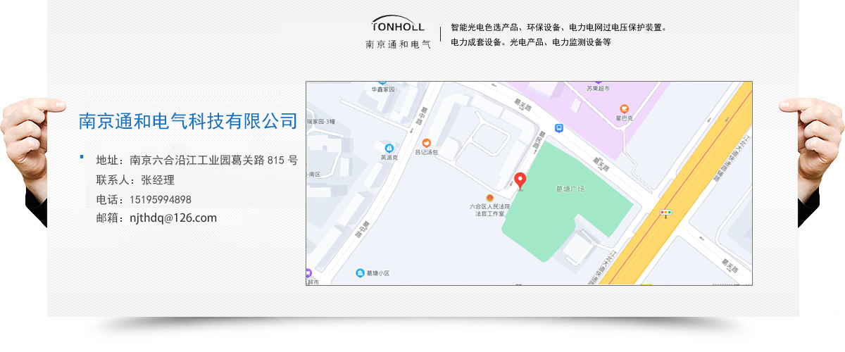 南京通和電氣科技有限公司是致力于研發(fā)、 生產(chǎn)防雷產(chǎn)品的科技型企業(yè)。公司集研發(fā)、生產(chǎn)、銷售、服務(wù)為一體,目前主要產(chǎn)品為:智能光電色選產(chǎn)品、環(huán)保設(shè)備、電力電網(wǎng)過電壓保護(hù)裝置。電力成套設(shè)備。光電產(chǎn)品、電力監(jiān)測設(shè)備等。公司秉承“誠信。創(chuàng)新、和諧。卓越”的經(jīng)營理念,研發(fā)創(chuàng)新的專業(yè)態(tài)度服務(wù)客戶,追求卓越,以其高水準(zhǔn)的產(chǎn)品品質(zhì)和良好的企業(yè)信譽,在發(fā)展進(jìn)程中得到了社會廣泛認(rèn)可。